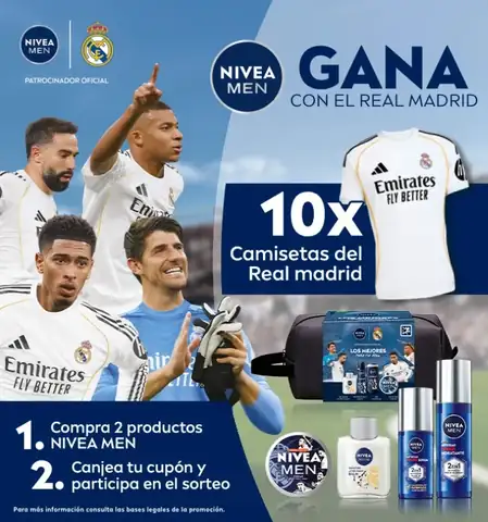 Compra 2 productos Nivea Men en El Corte Inglés, introduce tu código y participa para ganar camisetas oficiales del Real Madrid.